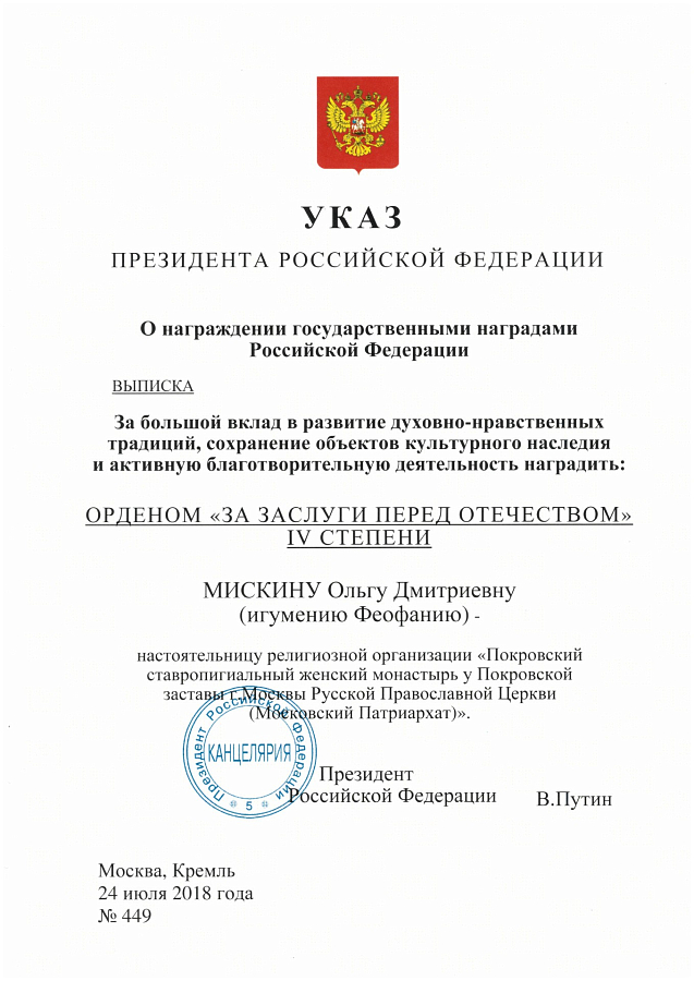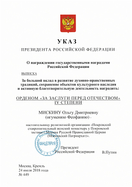 Среди награжденных – настоятельница Покровского ставропигиального женского монастыря Москвы игумения Феофания (Мискина), которой глава государства за большой вклад в развитие духовно-нравственных традиций, сохранение объектов культурного наследия и активную благотворительную деятельность вручил орден «За заслуги перед Отечеством» IV степени.