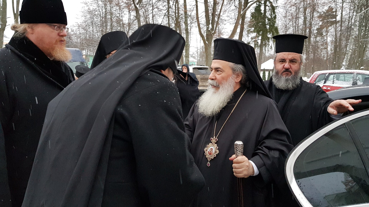 Предстоятеля Иерусалимской Православной Церкви сопровождали архиепископ Константинский Аристарх, архиепископ Иорданский Феофилакт, представитель Патриарха Иерусалимского при Патриархе Московском и всея Руси архимандрит Стефан (Диспиракис), архидиакон Марк (Хендерсон).