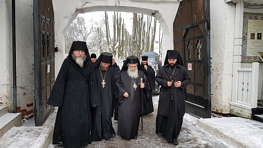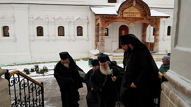 У врат обители Блаженнейшего Патриарха Феофила встретил наместник монастыря архимандрит Савва (Фатеев) с братией.