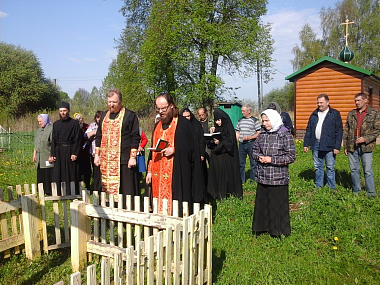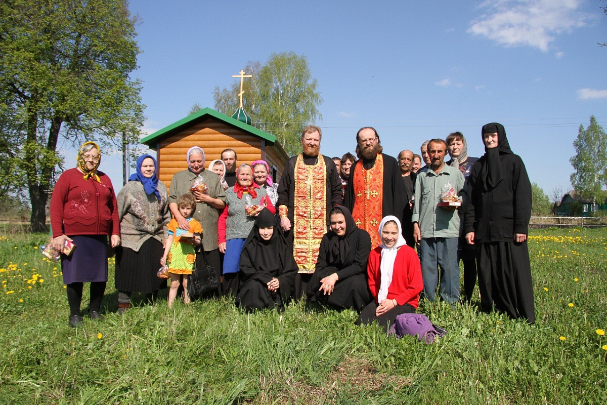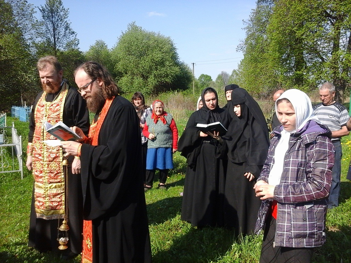 Сестер приветствовал благочинный Рославльского благочиннического округа протоиерей Михаил Гольцман. Вместе со священником Георгием он совершил заупокойное богослужение для местных жителей, собравшихся помянуть своих родных и близких в преддверии Радоницы. Панихиду служили под открытым небом у поклонного Креста, которым обозначено место некогда возвышавшегося здесь храма, возведенного тщанием деда прославленного русского поэта Ф.И. Тютчева и взорванного в 60-е годы XX века. В настоящее время богослужения изредка совершаются в маленьком храме, оборудованном из строительного вагончика. Сельчане с благодарностью ценят нечастую возможность помолиться за уставным богослужением.