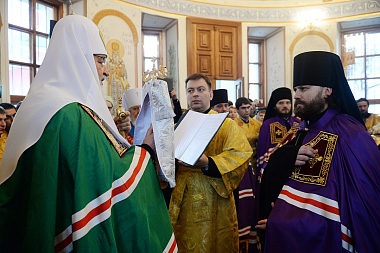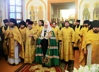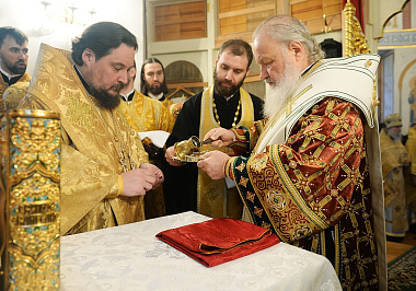 Предстоятель Русской Православной Церкви совершил чин великого освящения собора в честь Святой Живоначальной Троицы Борисоглебского Аносина монастыря, а затем возглавил служение Божественной литургии в новоосвященном храме.