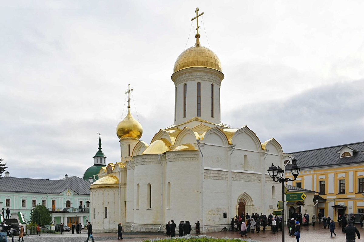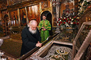Святейший Владыка проследовал в Троицкий собор Лавры, где поклонился честным мощам преподобного Сергия Радонежского. Предстоятель также поклонился святыням Никоновского придела и Серапионовой палаты.