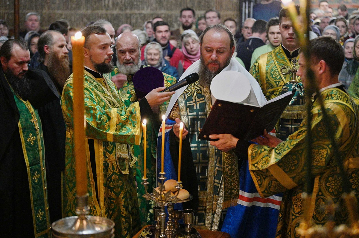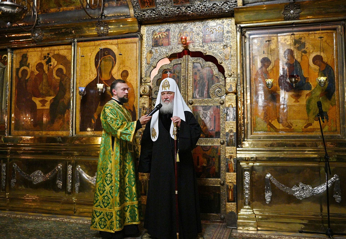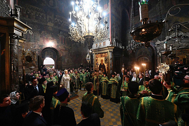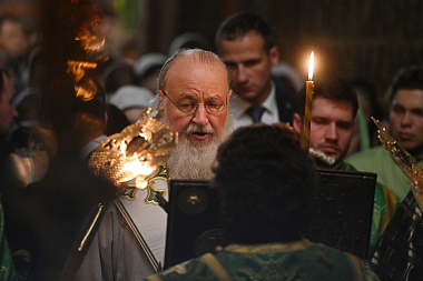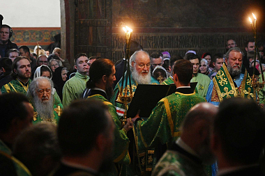 По завершении всенощного бдения Предстоятель Русской Православной Церкви поздравил участников богослужения: