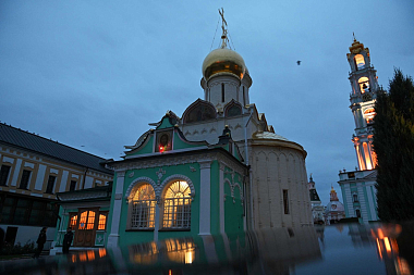 В Сергиевском трапезном храме малую вечерню с чтением акафиста преподобному Сергию совершили митрополит Воронежский и Лискинский Сергий и Преосвященные архипастыри, прибывшие в Свято-Троицкую Сергиеву лавру к престольному празднику.