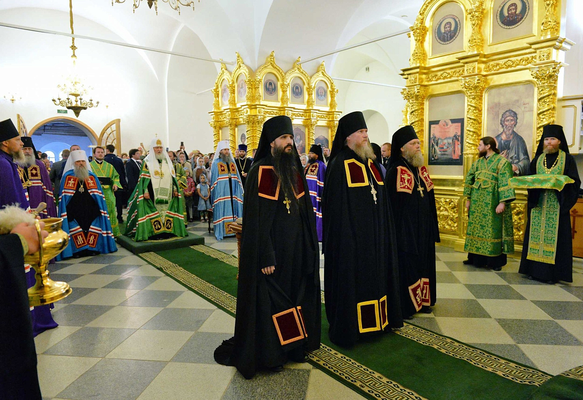 Его Святейшеству сослужили: митрополит Санкт-Петербургский и Ладожский Варсонофий, управляющий делами Московской Патриархии; митрополит Архангельский и Холмогорский Даниил; архиепископ Сергиево-Посадский Феогност, председатель Синодального отдела по монастырям и монашеству, наместник Свято-Троицкой Сергиевой лавры; архиепископ Солнечногорский Сергий, руководитель Административного секретариатаМосковской Патриархии; архиепископ Петропавловский и Камчатский Артемий; архиепископ Егорьевский Матфей; епископ Нарьян-Марский и Мезенский Иаков; епископ Котласский и Вельский Василий; епископ Домодедовский Иоанн, наместник Новоспасского ставропигиального монастыря; епископ Плесецкий и Каргопольский Александр; архимандрит Ипатий (Голубев), избранный во епископа Анадырского и Чукотского; архимандрит Порфирий (Шутов), наместник Соловецкого монастыря; насельники Соловецкой обители в священном сане.