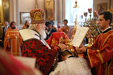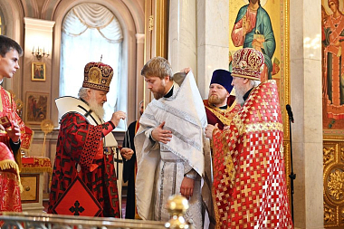 За Литургией Святейший Патриарх Кирилл совершил иерейскую хиротонию диакона Павла Патокина, студента магистратуры Сретенской духовной семинарии.