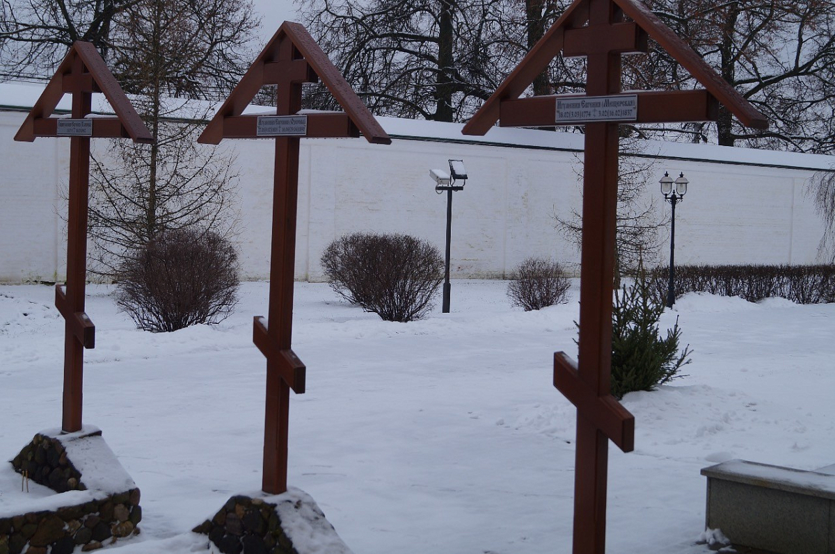 Места захоронения трех игумений были обретены при восстановлении обители. Останки схиигумении Евгении перенесены и перезахоронены возле могил основательницы монастыря и ее внучки. Все три могилы находятся возле придела Свв. кнн. Бориса и Глеба Троицкого собора. Сестры, ежедневно совершая крестный ход вокруг монастыря, поют литию на месте захоронения игумений обители.