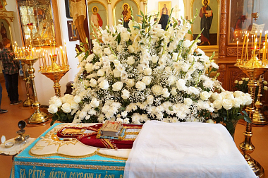 Накануне, 27 августа, во время Всенощного бдения Плащаница Божией Матери была торжественно вынесена на середину храма и возложена на украшенной цветами гробнице. Во все время пребывания Плащаницы в храме пред нею возжигаются свечи, горит неугасимая лампада, воскуряется благовонный ладан. В честь праздника перед Плащаницей торжественно был прочитан акафист Успения Матери Божией.