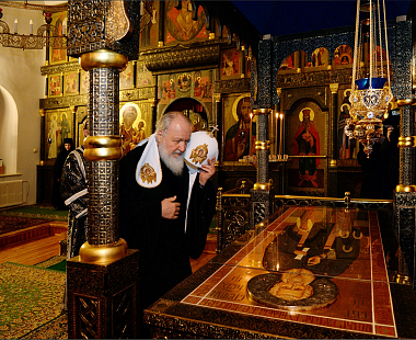 Затем в храме преподобного Стефана Махрищского Святейший Патриарх Кирилл поклонился мощам святого Стефана.
