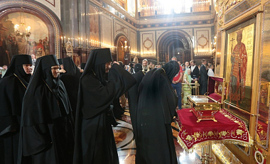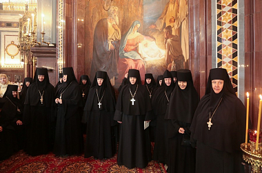 Молитвенное участие в праздничном богослужении приняли игумены и игумении монастырей Русской Православной Церкви во главе с Председателем Синодального отдела по монастырям и монашеству архиепископом Сергиево-Посадским Феогностом и Его Заместителем, настоятельницей Зачатьевского ставропигиального женского монастыря игуменией Иулианией (Каледой).