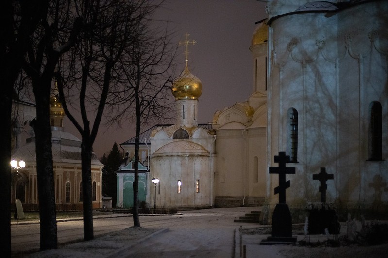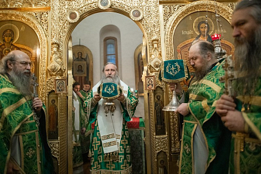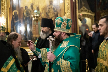 Накануне праздника наместник монастыря епископ Сергиево-Посадский Парамон возглавил всенощное бдение в Успенском соборе Лавры.