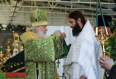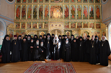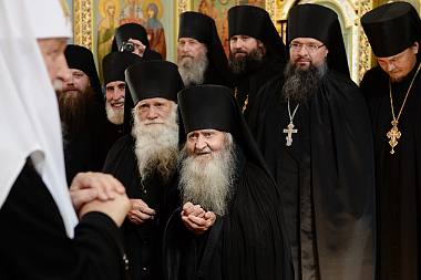 Святейший Патриарх Кирилл поблагодарил архимандрита Савву (Фатеева) за труды и вручил юбилейный крест, изготовленный по случаю празднования 1000-летия преставления Крестителя Руси. Насельникам обители Святейший Владыка передал богослужебные Евангелия.