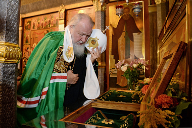 После торжественной встречи у святых врат Святейший Патриарх Кирилл поклонился честным мощам преподобного Саввы Сторожевского, покоящимся в древнем соборе Рождества Богородицы.