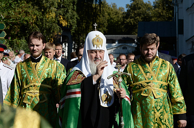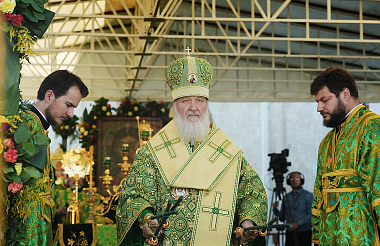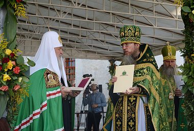 На Престоле, установленном под сенью на монастырской площади, Предстоятель Русской Православной Церкви совершил Божественную литургию.