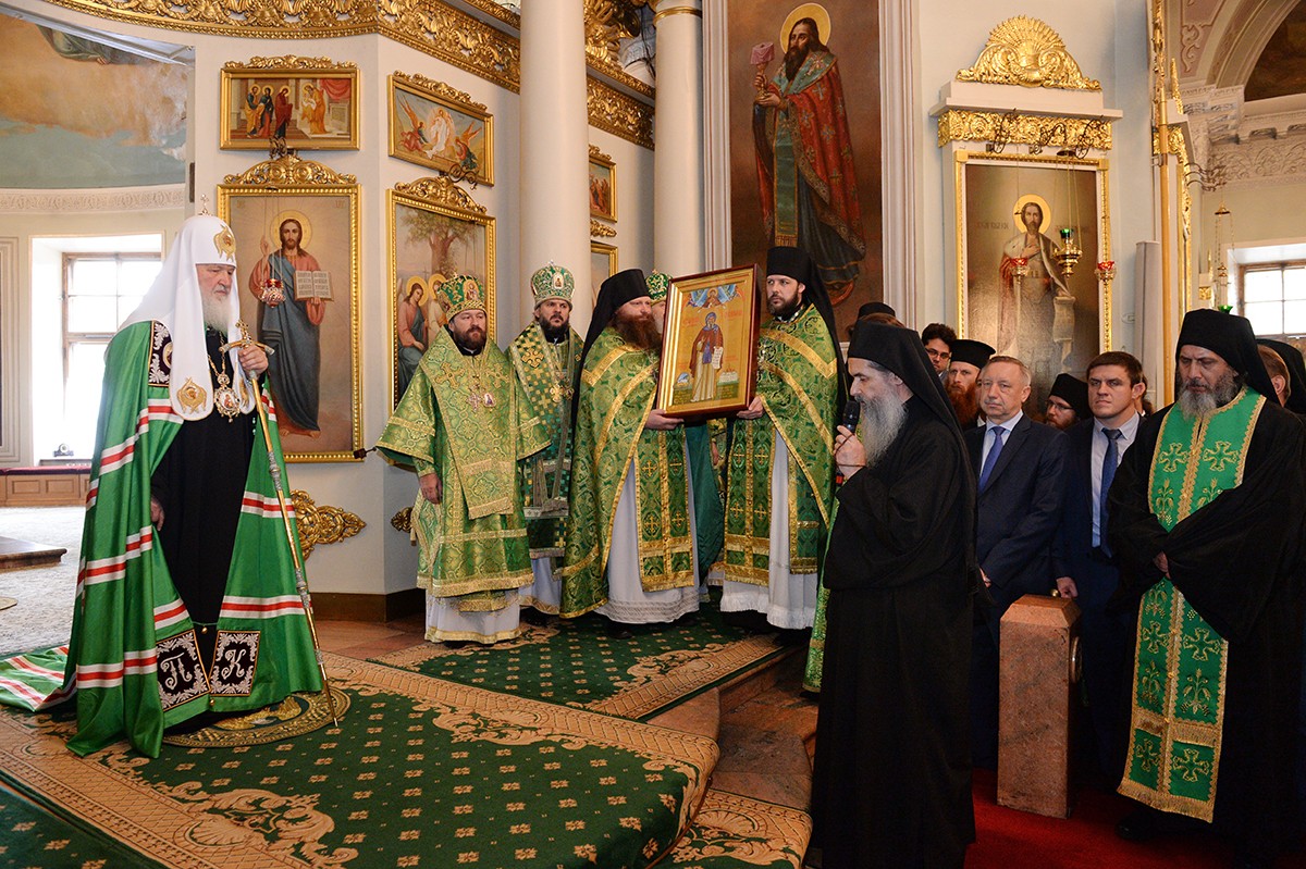 От лица святогорской братии иеромонах Кирион (Ольховик) приветствовал Святейшего Владыку и преподнес Его Святейшеству икону преподобного Антония Киево-Печерского, родоначальника русского монашества, представителя русских святогорцев, который принял постриг на Афоне в первой русской обители Успения Божией Матери – Ксилургу.