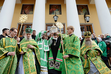 Затем Святейший Патриарх Кирилл торжественно перенес ковчег с главой преподобного Силуана Афонского из Троицкого собора на соборную площадь монастыря. Святыня была передана представителям Фонда святителя Василия Великого и священнослужителям, которые доставят ее к месту постоянного пребывания – в Русский Пантелеимонов монастырь на Афоне.
