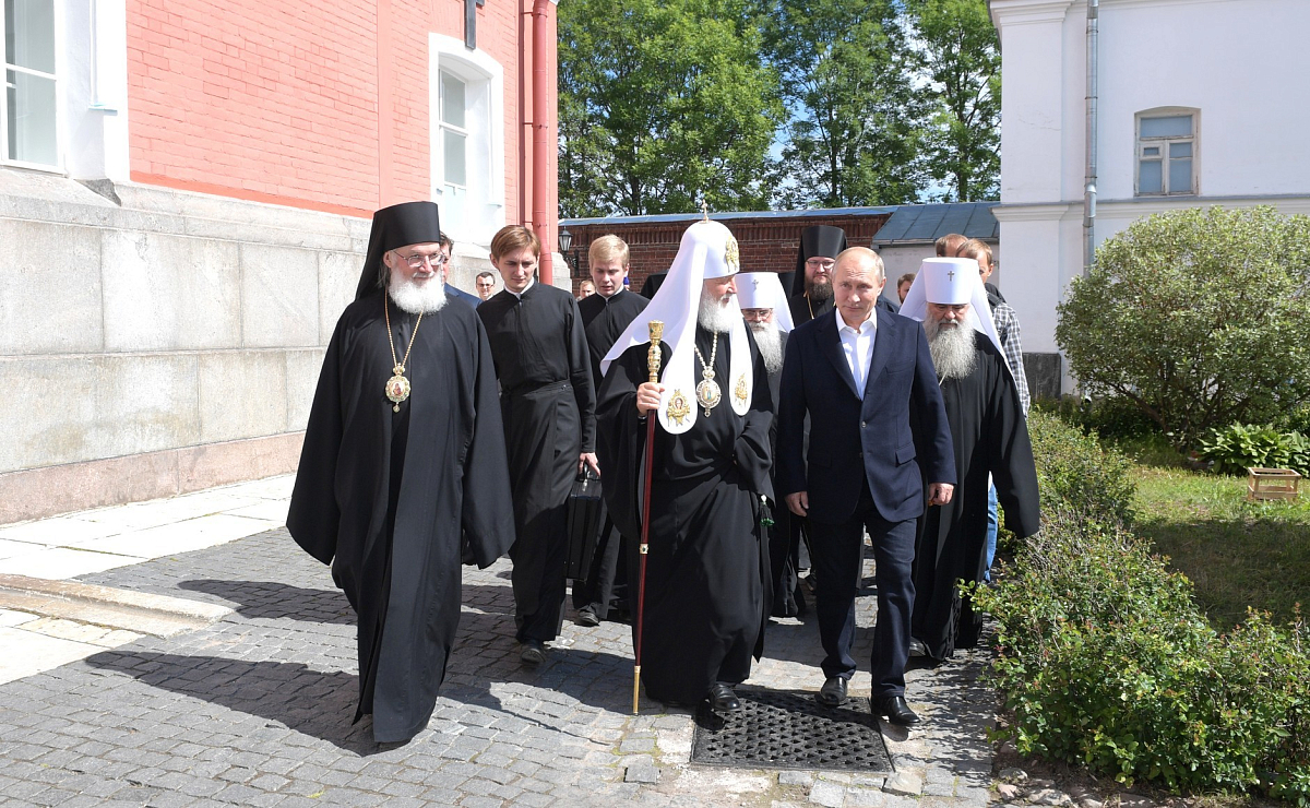Президент России В.В. Путин и Святейший Патриарх Кирилл в сопровождении архиереев и духовенства спустились в нижний храм Спасо-Преображенского собора, где было совершено славление у честных мощей преподобных Сергия и Германа. Глава государства и Предстоятель Русской Церкви после молитвы основателям обители поклонились их святым мощам.