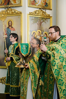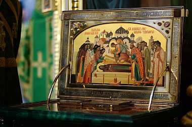 По окончании Литургии Святейший Владыка совершил славление и прочитал молитву перед ковчегами с частицами мощей святых благоверных князей Даниила Московского и Александра Невского.