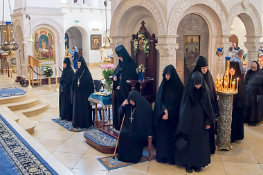 За богослужением молились: Заместитель Председателя Синодального отдела по монастырям и монашеству, настоятельница Зачатьевского ставропигиального женского монастыря игумения Иулиания (Каледа) с сестрами; настоятельница Полоцкого Спасо-Евфросиниевского женского монастыря игумения Евдокия (Левшук); настоятельница монастыря Святой Параскевы на о. Корфу (Греция) игумения Фотиния (Маршал); настоятельница Свято-Вознесенского женского монастыря Проти Серрон (Греция) игумения Анисия; настоятельница женского монастыря Преподобной Софии Слуцкой (Беларусь) игумения Анастасия.