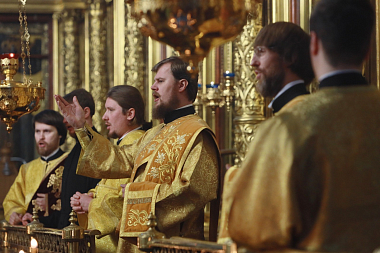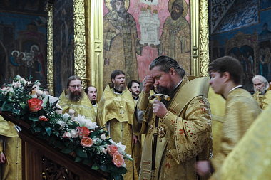 Его Высокопреосвященству сослужили Секретарь Патриарха Московского и всея Руси по г. Москве протопресвитер Владимир Диваков, братия обители в священном сане и духовенство Центрального викариатства.