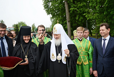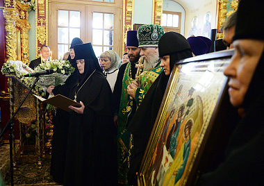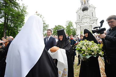 По окончании Литургии игумения Феофания (Мискина) приветствовала Святейшего Владыку и преподнесла Его Святейшеству икону Святой Троицы.