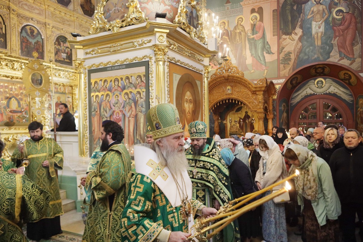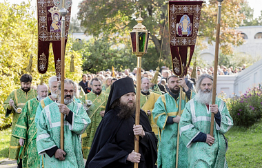 По окончании Литургии состоялся крестный ход вокруг Успенского собора монастыря. После чего владыка Феогност передал братии и прихожанам поздравления от имени Священноархимандрита обители – Святейшего Патриарха Московского и всея Руси Кирилла и обратился к собравшимся с архипастырским словом.