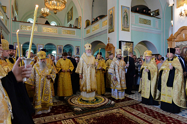 Его Святейшеству сослужили: митрополит Санкт-Петербургский и Ладожский Варсонофий, управляющий делами Московской Патриархии; архиепископ Солнечногорский Сергий, руководитель Административного секретариата Московской Патриархии; протоиерей Сергий Куксевич, секретарь Санкт-Петербургского епархиального управления; протоиерей Николай Беляев, старший священник Иоанновского ставропигиального монастыря.