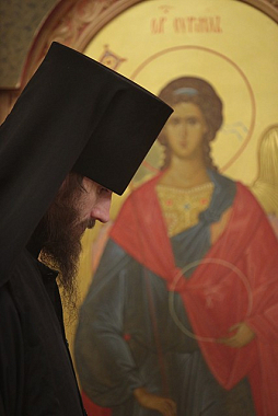 По совершении чина наречения Святейшего Владыку приветствовал наместник обители архимандрит Венедикт (Пеньков).