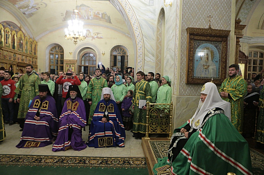 В главном храме обители – соборе в честь Введения во храм Пресвятой Богородицы, где покоятся святые мощи преподобных Амвросия и Нектария, старцев Оптинских, – Предстоятель Русской Православной Церкви совершил Всенощное бдение.