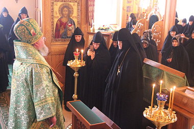 По окончании богослужения владыка Никита поздравил настоятельницу монастыря игумению Сергию (Щербакову), сестер и паломников с праздником, который имеет особое значение для обители: