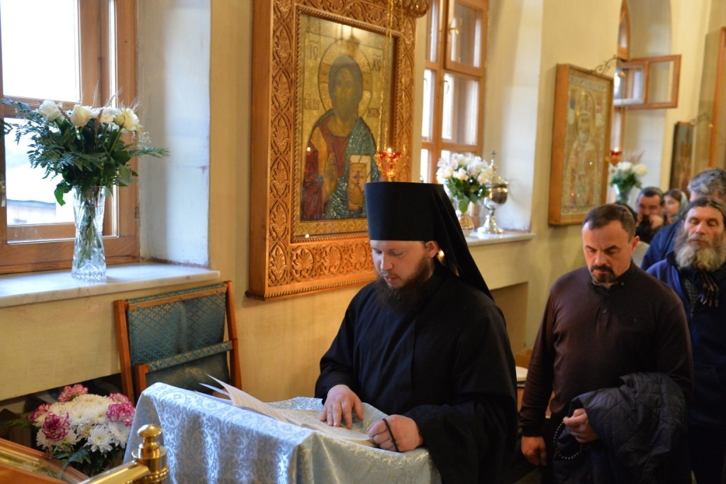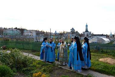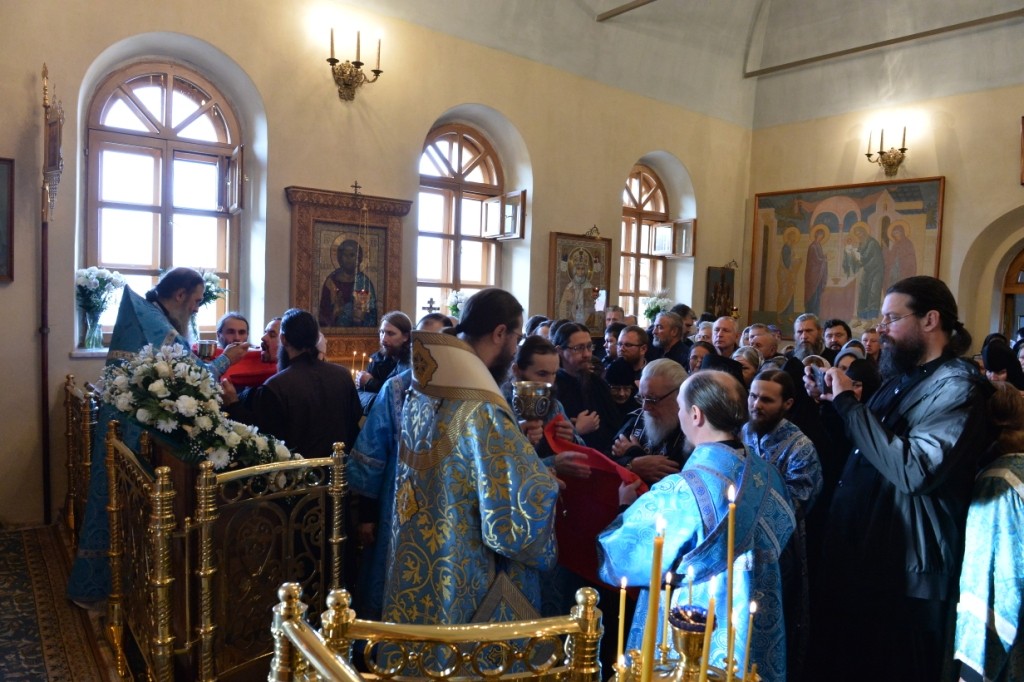 Отцу наместнику сослужила братия в священном сане, исполняющая свои послушания на подсобном хозяйстве обители.