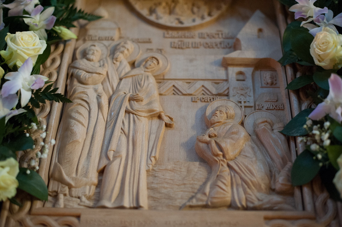 Затем для гостей провели небольшую экскурсию по маленькому храму Преподобного Сергия, построенному в стенах дома-интерната еще до возведения большого каменного храма в честь Явления Пресвятой Богородицы преподобному Сергию Радонежскому.