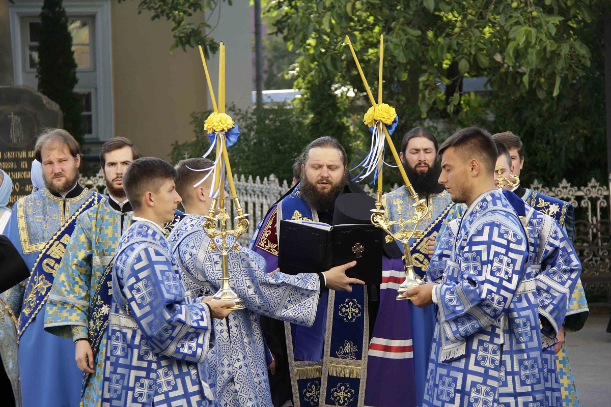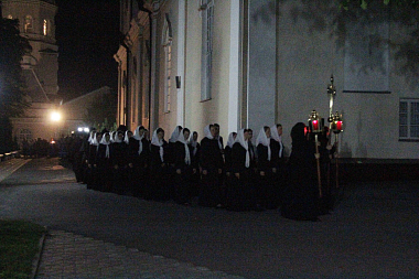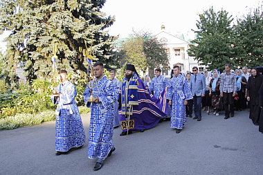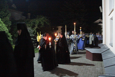 Всенощное бдение возглавил также митрополит Ириней. По сложившейся монастырской традиции литию вокруг храма совершил епископ Пимен. На утрени был отслужен чин Погребения Божией Матери. По великом славословии при пении погребального «Святый Боже…» крестным ходом Плащаницу обнесли вокруг храма.
