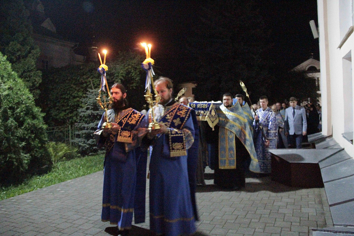 Накануне митрополит Днепропетровский и Павлоградский Ириней отслужил малую вечерню с выносом Плащаницы Богоматери из Успенского придела на середину Троицкого храма и пением нараспев акафиста Успению Богородицы.