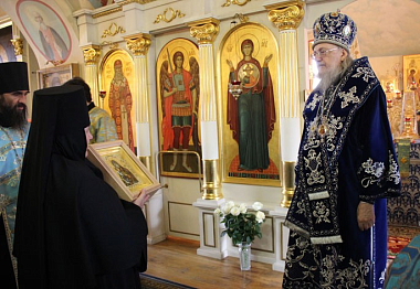 Настоятельница монастыря игумения Екатерина (Чайникова) поблагодарила Владыку за совершение Божественной литургии. В дар Его Преосвященству на память об этом дне был преподнесен список с иконы Божией Матери «Иерусалимская», написанной в XIX веке для сестер обители и недавно возвращенной в монастырь.