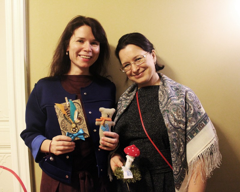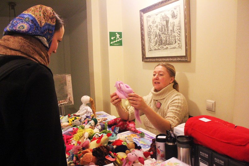 В холле Голубой гостиной, в уютном и теплом помещении, расположились столы с монастырской выпечкой, а на втором этаже можно было приобрести красивые рождественские подарки: игрушки и декоративные изделия ручной работы, а также открытки и календари с чудесными рисунками художника Елизаветы Цымбаревич.