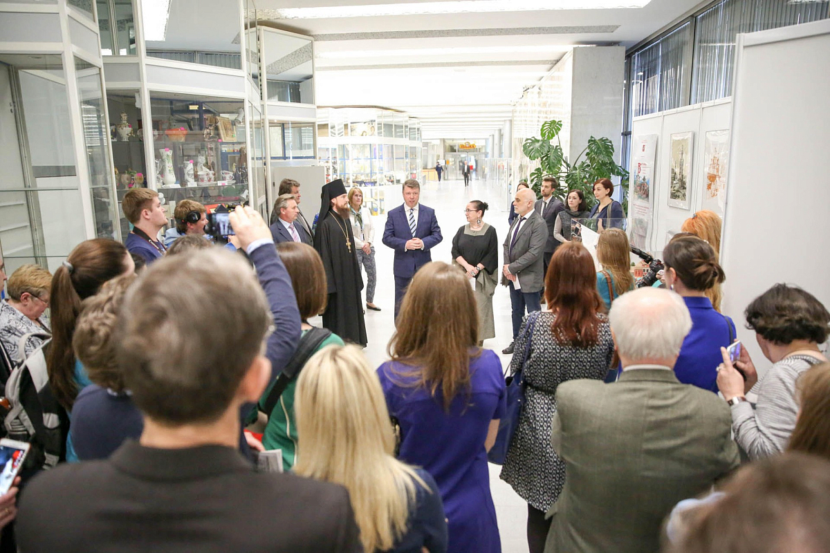 Первым к гостям выставки обратился Владимир Черников. По словам руководителя департамента, данная выставка – свидетельство того, что в России возрождается религиозная жизнь. Глядя на эскизы, на которых изображены храмы и древний Петровский монастырь, радуется сердце, признался Владимир Черников. Он также поблагодарил организаторов выставки и выразил пожелание, чтобы подобных экспозиций с каждым годом становилось все больше.