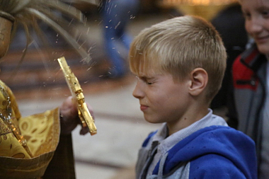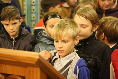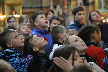 Встреча с древней обителью для 40 воспитанников школы-интерната началось с благодарственного молебна в Спасо-Преображенском соборе. Насельник монастыря иеромонах Филарет благословил школьников на праведные ученические труды и щедро окропил святой водой. Для ребят, впервые пришедших в храм и впервые услышавших слова молитвы, это совершенно новый и ни с чем не сравнимый духовный опыт, опыт прикосновения к тайне богопознания.
