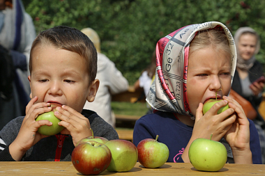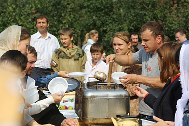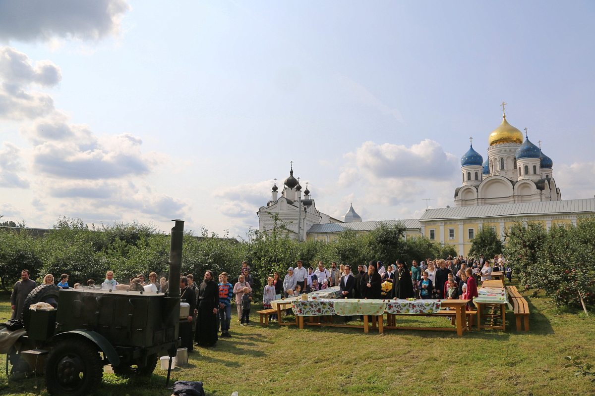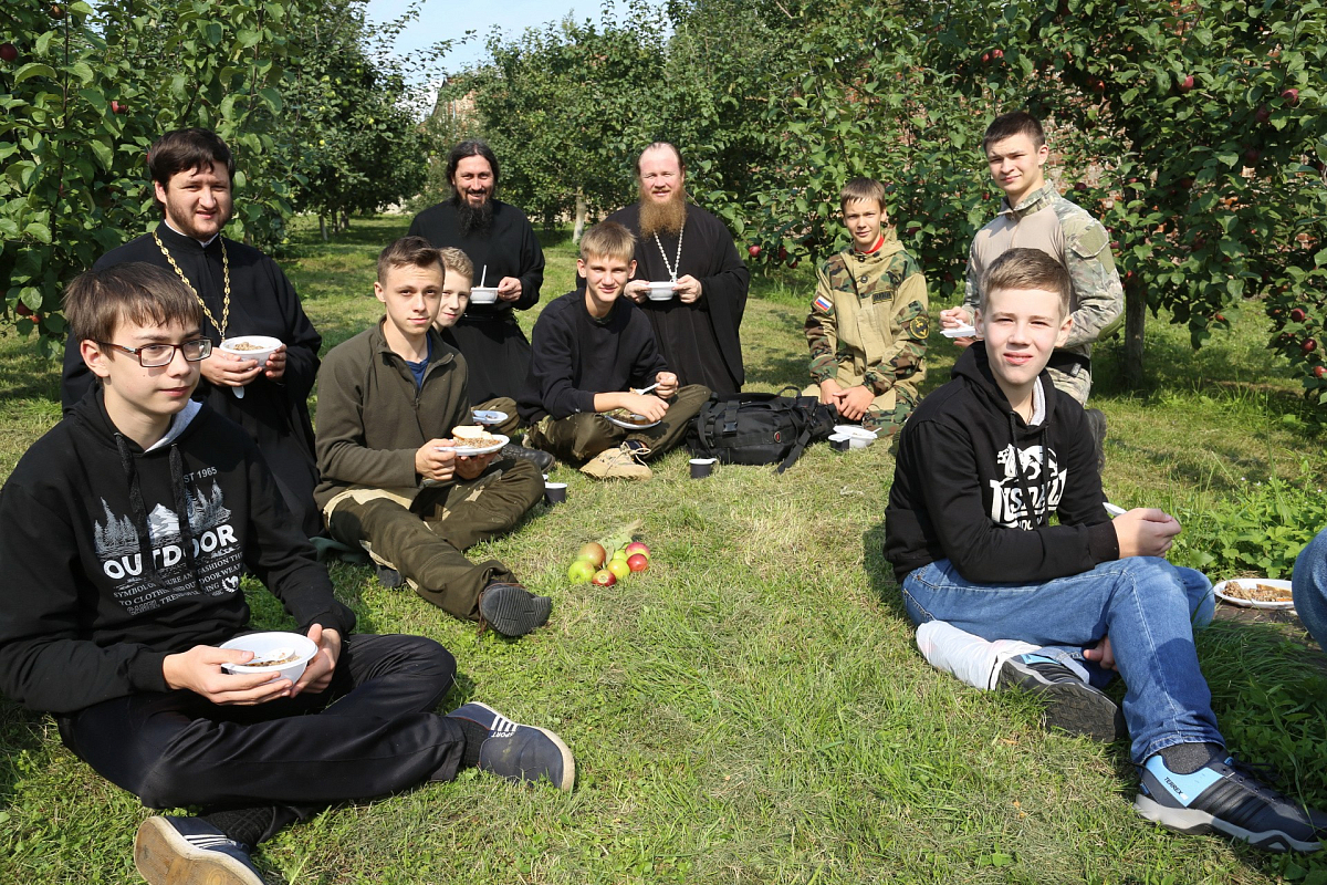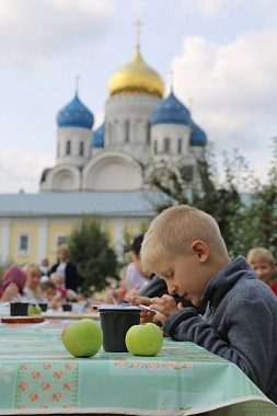 Получив молитвенное благословение, ребята вместе со своими духовными наставниками, педагогами и родителями отправились в монастырский сад. Здесь под сенью плодовых деревьев были накрыты столы. Гречневая каша из военно-полевой кухни, компот да поспевшие ароматные осенние яблоки и груши способствовали созданию по-домашнему теплой атмосферы, которая этим солнечным днем одинаково согревала сердца и детей, и взрослых.