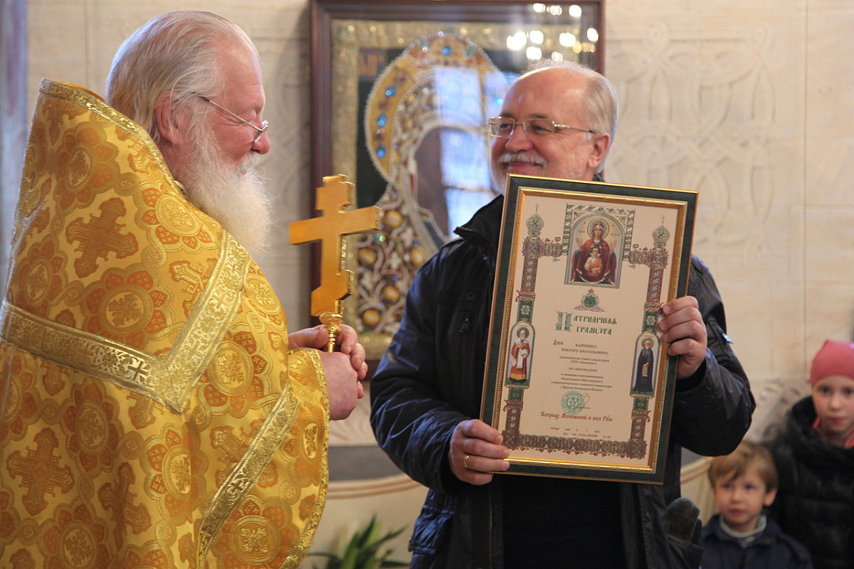 Протоиерей Владимир вручил В.А. Карпенко Патриаршую грамоту за помощь в восстановлении Никольского храма обители.