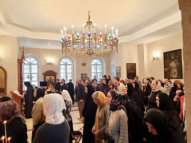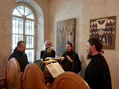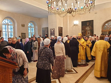 Его Преосвященству сослужили братия в священном сане, а также насельник Михаило-Архангельского мужского монастыря Новосибирской митрополии иеромонах Николай (Трачев) и иеромонах Кирилл (Саввин) из Успенского мужского монастыря Орловской епархии.