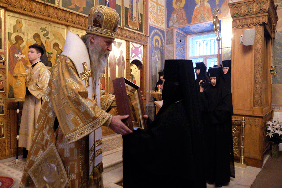 В завершение Его Высокопреосвященство поздравил игумению Олимпиаду с праздником и преподнес в дар икону Пресвятой Богородицы.