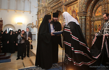 По окончании богослужения настоятельница Зачатьевского монастыря, заместитель председателя Синодального отдела по монастырям и монашеству игумения Иулиания (Каледа) приветствовала Предстоятеля Русской Православной Церкви. Игумения Иулиания поздравила Святейшего Патриарха с началом Святой Четыредесятницы и днем памяти святого равноапостольного Кирилла, учителя Словенского, и преподнесла Его Святейшеству икону с изображениями Его Небесных покровителей – святого равноапостольного Кирилла и святителя Марка Эфесского (в день памяти этого святого состоялась интронизация Святейшего Патриарха Кирилла), – а также набор светильников.