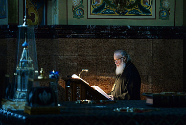 По окончании богослужения наместник обители игумен Варфоломей (Петров) приветствовал Предстоятеля Русской Православной Церкви.