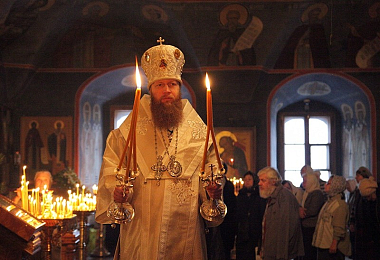 Позднюю Божественную Литургию возглавил наместник Новоспасской обители, викарий Святейшего Патриарха Московского и всея Руси епископ Воскресенский Савва.
