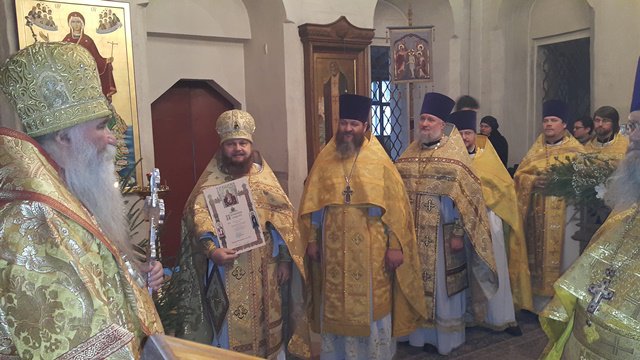 Затем по благословению Святейшего Патриарха Московского и всея Руси Кирилла епископ Феофилакт вручил Патриаршую грамоту насельнику Андреевской обители архимандриту Петру (Полякову) в связи с его 30-летним служением в священном сане.