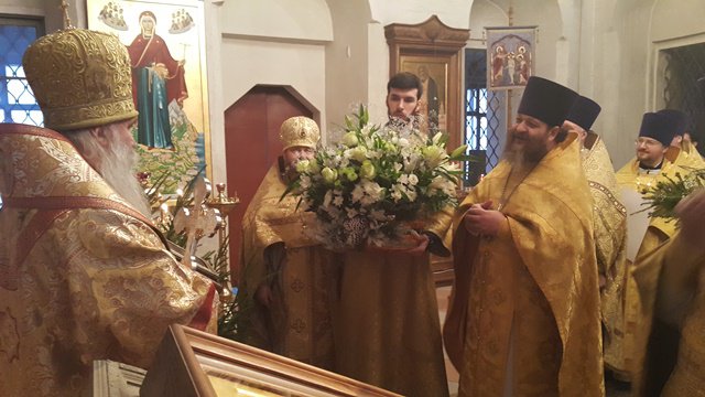 Его Преосвященству сослужили члены Совета Юго-Западного викариатства, настоятели приходов и подворий, клирики викариатства и обители. Молитвенное участие в Божественной литургии приняли клирики храмов Юго-Западного викариатства, прихожане монастыря и паломники.