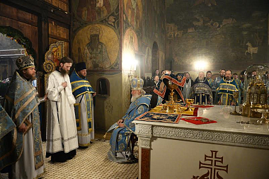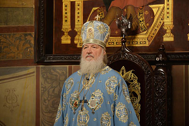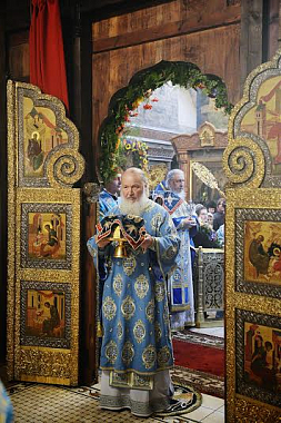 По окончании богослужения наместник обители архимандрит Тихон приветствовал Предстоятеля Русской Православной Церкви и преподнес Его Святейшеству список Владимирской иконы Божией Матери.
