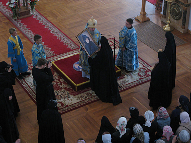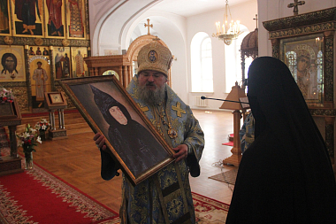 В знак любви и благодарности матушка Сергия передала Преосвященному Никите вышитый сестрами Владимирский образ Пресвятой Богородицы.
