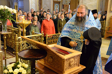 Преосвященный Леонид поздравил матушку игумению и насельниц с принесением большой частицы мощей преподобного Амвросия, покровителя монастыря.